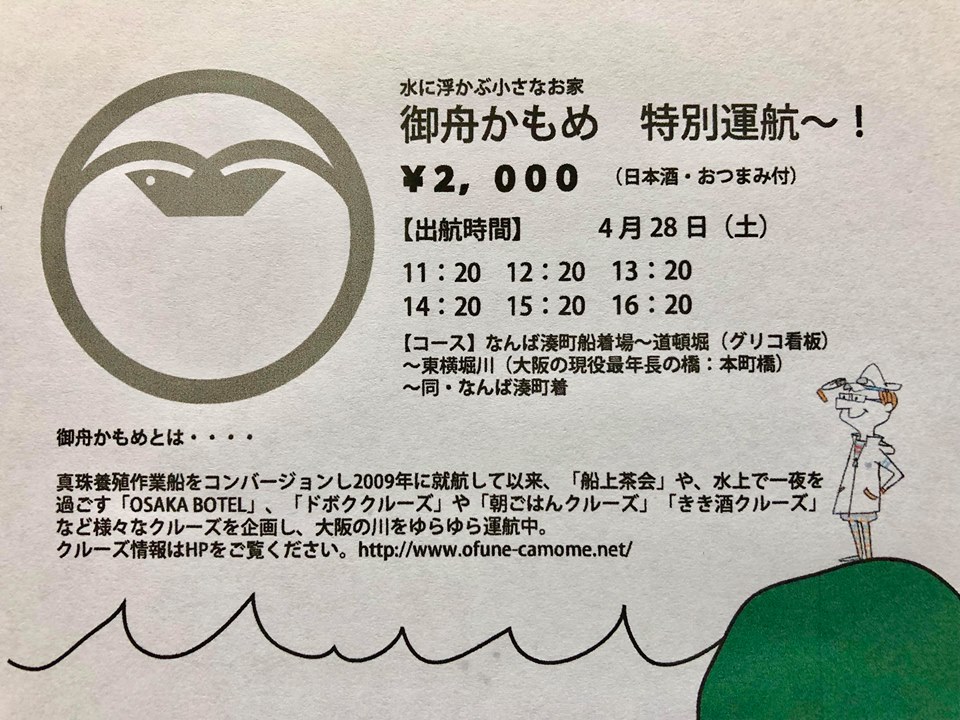 4/28(土)湊町リバープレイスで開催される「上方日本酒ワールド」に合わせて特別運航します! 11:20より、毎時20分出航(最終16:20)