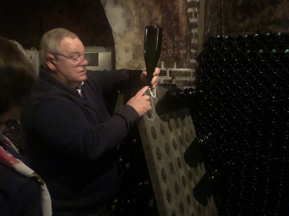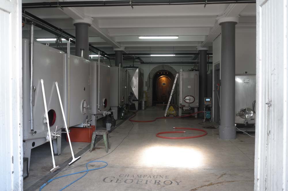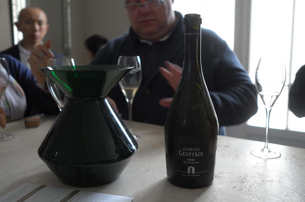 3日午後は、同じアイ村のジェフロイを見学させていただきました。 小さな生産者で、自分の畑でオーナー化して5世代、それまではブドウを作る農家であった。 年間14万本造っている。 発酵タンクは鉄のタンク(写真3枚目)イノックス、80年前の樽で発酵させ、コンクリートは使っていない。 キュミエール村にある畑は収穫が早く、南東で糖分が高いため、酸味が弱く丸くなるので、マロラクティック(乳酸)発酵はしないのが造りの特徴。 一次発酵が18度くらいで終わったら温度を10度まで下げて発酵を止める。 酒質の方針は、お客様に合わせるのではなく、元々の畑の個性を引き出すこと。 自然の酸味を生かしたいと思っている。長期熟成型で、代々の畑を守ることが目標。 樽は、どう関わるかが造りの特徴であるので、フランス産オークを使用し、発酵と熟成もそのままの樽で行う。 しかしテノワールを大事にすると樽の影響をできるだけ与えたくない、そのため新樽は使わず、中古を買って使った方が良いと考えている。 18世紀の地下カーブ(写真4~6枚目)は、同温度で一定であれば良いことと、石灰質なので掘るのが容易なために作られた。 ストックは100万本。ノンビンテージ3年、ビンテージは5年寝かせている(写真7枚目)重さや複雑味よりも、雑味が少なく爽やかで、日本人が好きなタイプで美味しい。