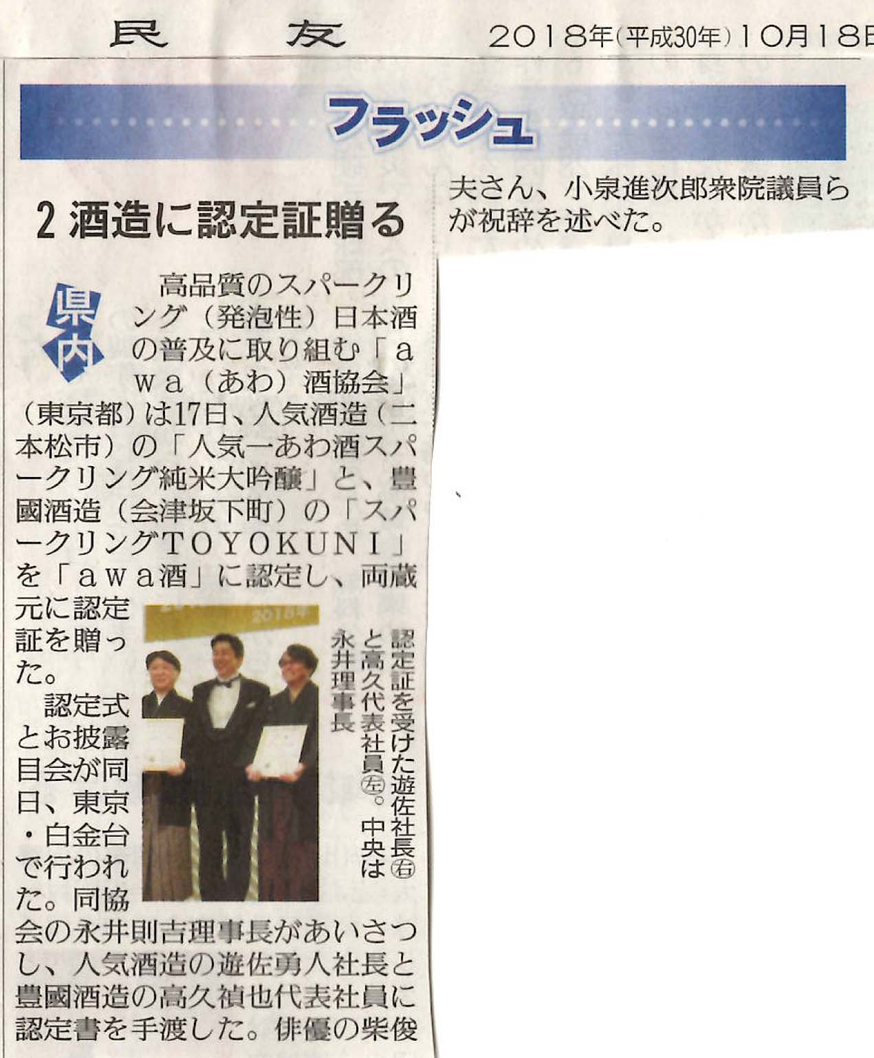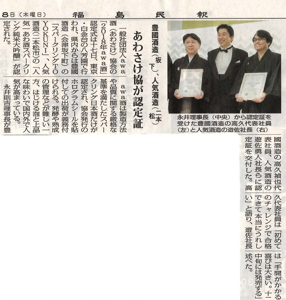あわ酒スパークリング純米大吟醸がawa酒協会の認定を受けた記事を地元の新聞社に掲載いただきました。 この商品は、濁りの無い瓶内発酵のスパークリング日本酒で、世界に通用する厳格なawa酒協会の品質基準に沿って造られ、地元産の酒造好適米、米麹、水のみを使用して、火入れ殺菌を行い、熟成させ、香味・品質が安定した新しいお酒です。