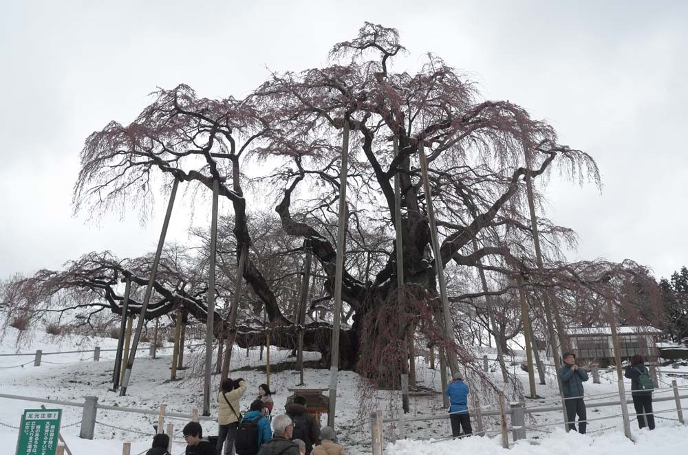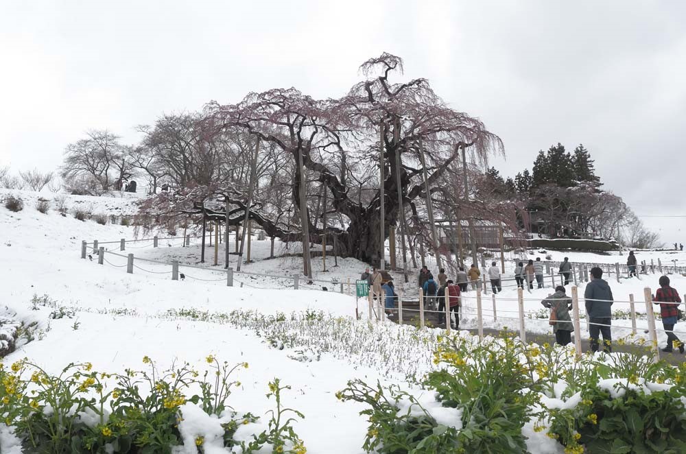 4月11日はアメリカからのお客様と一緒に、三春の滝桜に行ってきました。 当日はまだ5分咲きでしたが、季節外れの大雪となり、雪の中で咲いた滝桜を見る事が出来ました。
